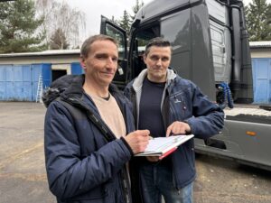 Foto: Messtechnische Untersuchungen am Lkw: Dr. Rico Ganßauge (li.) und Dr. Roberto Kockrow erfassen die Geräuschsituation im Fahrerhaus, um die Effekte des Negus Comfort Boosters objektiv zu dokumentieren. (Foto: Tudyka.PR)